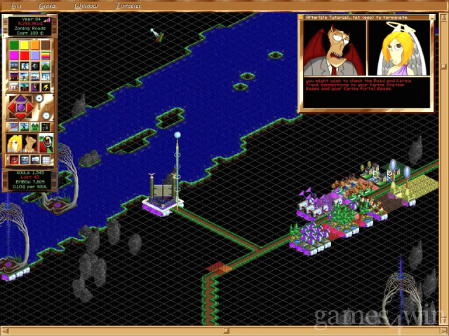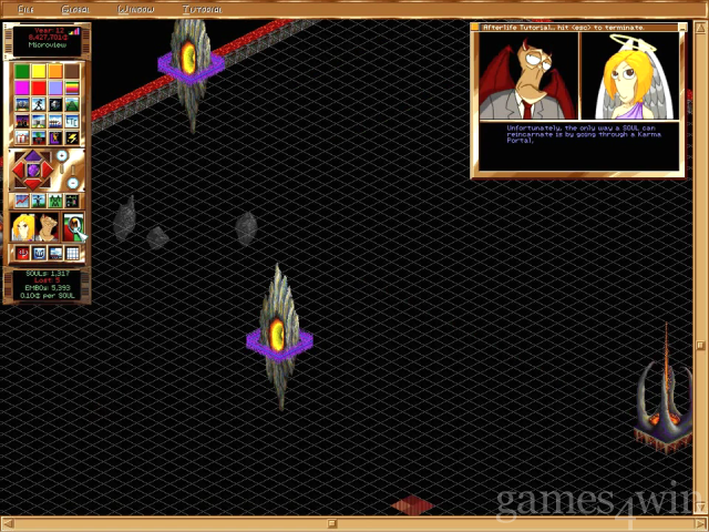 But Afterlife is a 'concept' god sim that sticks true to the original concept of Sim City and manages to keep something alive within it (no pun intended) well after the novelty factor has worn off. It's also the first god game in which you actually do play god. or close enough. The idea is that you are in charge of developing both Heaven (ahh-ahh-ah) and Hell (crackle, singe), making sure that all the lost souls that enter your pearly gates find either the spiritual reward of the virtuous or the eternal punishment of the damned. You do this by 'zoning' areas of your afterlife according to needs.