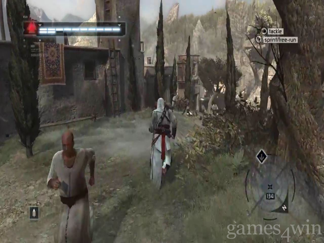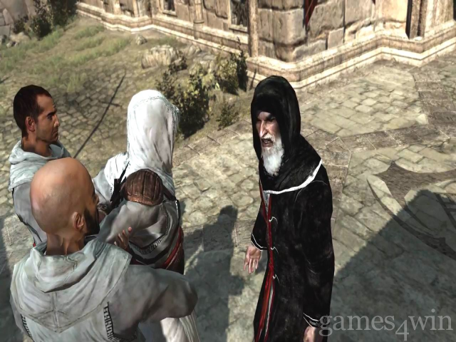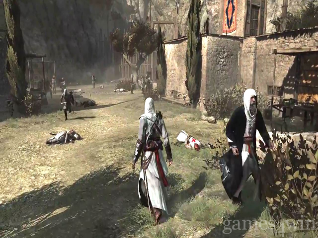 Scattered about cities you'll find citizens being harassed by soldiers. Saving these people by slaughtering the soldiers is in your best interest as doing so 'unlocks' one of two things during missions. The first are monks, who are dressed similarly to Altair. They'll let you walk with them, head bowed, past guard posts. This is usually the only way of getting to certain areas undetected and so monks will always be lurking nearby. The second are vigilantes, who will start fighting with any guards chasing you.
