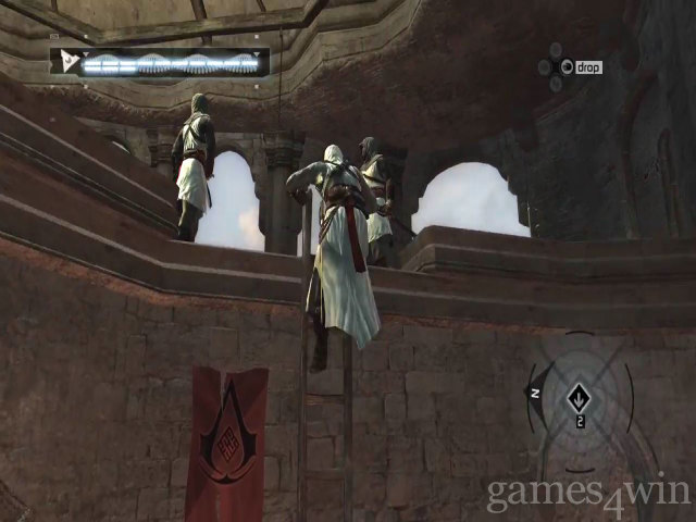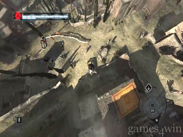 Except the Crusades isn't really when the game is set - the true setting is the near future, and your true character is a descendant of Altair, who's accessing his ancestor's memories through a (rather silly) genetic memory recalling machine. The slowly unfolding story plays out in both timelines, though in the present day you're trapped in a stainless steel laboratory. The tale is ridiculous, but it's so far-flung that you can't help but nod in admiration. How Ubisoft are really hoping to impress you though, is through the two-fold implementation of both crowd dynamics and free running acrobatics. Jerusalem, Acre and Damascus are the game's three atmospheric cities. They're sprawling urban i playgrounds - every wall and rooftop is effortlessly scaleable, giving you free reign to carve your own path through the city with unerring fluidity.