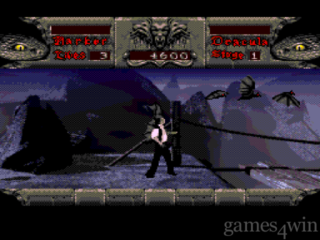 As the 19th century vampire hunter Jonathan Harker, you will battle Dracula and his minions through seven spectacular levels. Ultimately, you must destroy Dracula and release your kidnapped gal Lucy, who has joined the undead Your vampire hunt begins with Travel to Castle dracula, a dangerous journey through a dark, eerie forest. Once you've traversed the forest, you enter Castle Dracula, where you battle evil of all shapes and sizes, including bog creatures, Dracula's mesmerizing brides and the Count himself — as a vampire bat. 3-D is used to good effect in Castle Dracula; the room rotates as you enter and exit. From the Castle, your quest continues to Hillingham Estate and Carfax Abbey, then on to the final battle with Dracula.