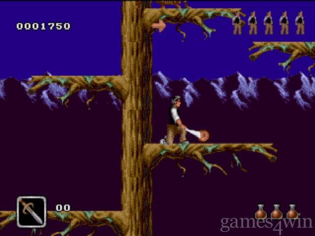As in countless other games your quest is the rescue of your lovely mistress, Mina Murray. You are the strapping Jonathan Harker and you must slash and hack your way through the levels using rocks, axes and torches. To get a better view of the action you can look up and down and use a jumping smash to fall through ledges and unusual rock floors. You start the game with 4 lives and you can collect others on the way as well as continues. Each section has a set time allotted in which you must complete the level. Clock tokens can be found which add 20 extra seconds to the timer and which are crucial in the last level.
