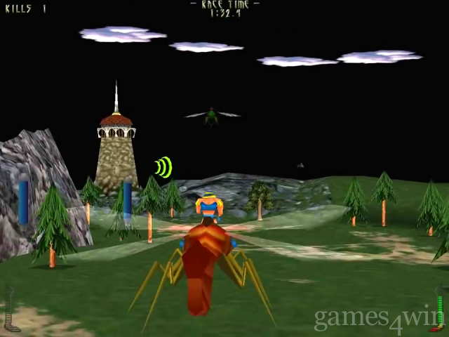 This surreal giant insect racer-cum-sboot 'em up is a port from the PlayStation Developers nSpace have taken a pinch of WipEout, added a dash of Slipstream 5000 and made giant flying insects the transport mode of choice. As with most PSX games, the general all-round presentation is v ery slick: 16 tracks, three play modes (Time trial, Exterminator and Campaign), up to eight-player link-ups, three skill levels and eight bizarre-looking "jockeys' to choose from. The game engine is well greased, with lovely scenery zooming past, even without 30 acceleration (it's much better with). Sadly, all the lush visuals and gloss can't disguise the gameplay flaws beneath.