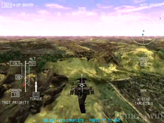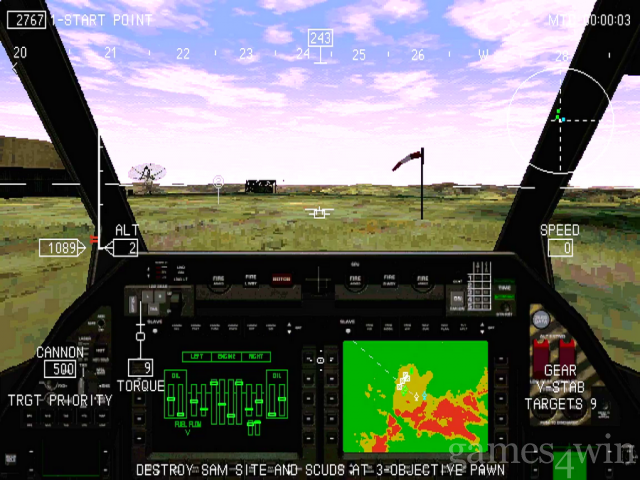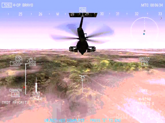 And as I've just said, things were now very tricky indeed. Yup, with the tutorial over I was being shot down with alarming regularity. Restart. Die. Restart. Die. Restart. Die. NovaLogic people were watching over my shoulder. I made excuse noises to the tune that I was using the 'realistic' flight model. And I was - but time for a rethink. Time to adhere less strictly to the direct waypoint routes, I felt, and time to use the superbly realised terrain to my advantage, rather than just enjoying it as eye candy. Yes, I could hug that treeline. Yes, I could drop into that hollow and then sideslip across the road to my right and let off a quick Hellfire before sideslipping back into cover again. Yes, I could then change tack and hack recklessly across an open field to hide behind those buildings on the northern side of the valley.