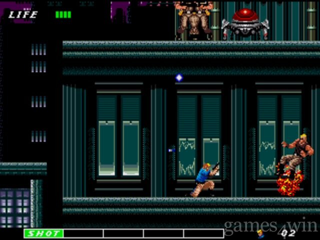 You begin your mission as a rookie. As such, all you have is your standard police special and your street smarts but fortunately, the thugs aren't too smart and this is a good training ground for perfecting your talents. Take out the first Boss Helicopter above the city your promotion. The second level takes you into the Cyber Prison and you run into your first taste of cyborgs gone bad. This gets you your ice suit and into the nuclear plant. Here you can gain your new weapons like the multi shot, rocket launcher, pulse canon and the ultimate tool ol destruction, the flame thrower! To ronew your life there are life up, life max and 1-up blocks to give you progressively more energy. All of which will be needed in the later levels where you go up against the illegal armies of the E.Y.E. and the technological terror they've constructed!