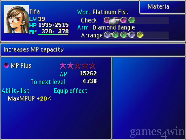 Put characters with ranged weapons on the back row, as they can dish out as much punishment from there but only take half damage. Give everyone a Restore/All materia combination -this means that anyone can cure the whole party if necessary. Also try to provide everyone with at least one offensive spell.