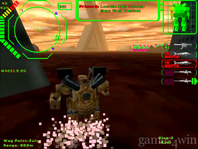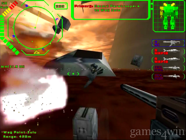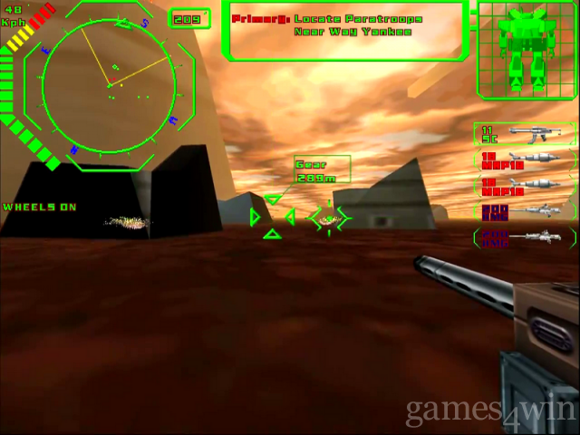 Heavy Gear is set in the badlands of Terra Nova, where the Confederated Northern City States and the Allied Southern Territories are having more than a little bit of a domestic over alleged border incursions by the South. All the usual training and multi-player missions are in place, as well as the obligatory choose-a-side style assignments; additionally, there's a story-led cinematic campaign where you play Ranger Scott, a top Gear (ho-ho) pilot on board the landship Vigilance. Players must progress through a series of missions lightly peppered with cut-scenes, create new Gears as new weapons and chassis become available and eventually fire some genuinely groovy weapons.