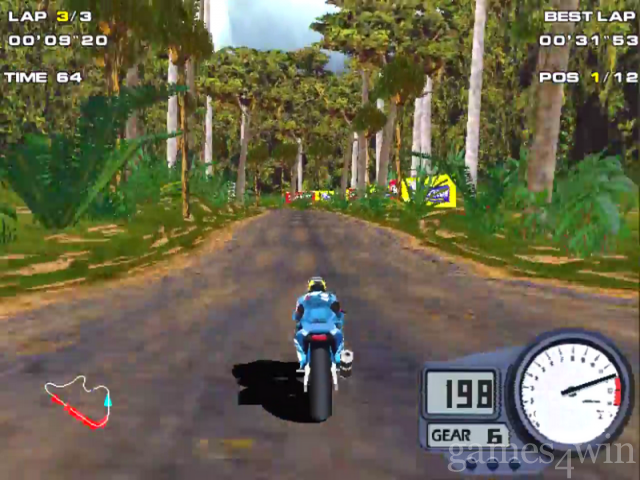 Let's examine the superbike option first Obviously, the graphics look alright, but it would be a disgrace if they didn't. The tracks are reasonable and the bikes are fairly realistic, the riders shifting around in their seats in a vaguely disturbing fashion. The handling is pretty simplistic, and effectively it's a car game on two wheels. Business as usual.