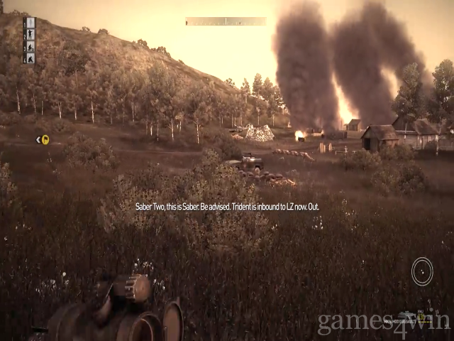 Commands can be delivered to Al teammates through a radial menu, with position-sensitive orders (orders to move, for example) being directed by your crosshair. You effectively point at things you want your men to run to -much how a real squad leader would dole out directives - while also telling them how you want them to behave as they go. This allows for cautious approaches, with your team only firing on your lead, or aggressive flanking manoeuvres over large distances.