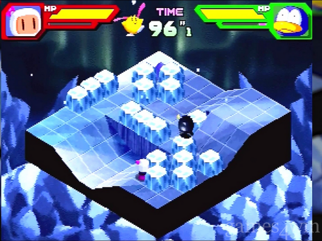 Not much information is available on the game yet, but we do know that there are 14 playable characters, each with differing characteristics that affect play. The game takes place from an overhead quarter-view, and there are some new gameplay aspects that haven't been in previous Bomberman games. For example, each player now has a life bar that will slowly deplete as he or she gets hit (instead of the old-school one-hit kills). There's also a Bomb Gauge that slowly builds up. and when it's full the player can unleash a giant bomb that does massive damage. In addition, bombs can now explode in midair (when thrown), and the flames that pour down will cause damage to anyone they hit. There are new items and power-ups as well, but the old-school play mechanics are still around (like the Bomb Throw and the Bomb Kick). Currently it doesn't look like there are any dinos or kangaroos like in previous Bombermans, but the game isn't done yet.