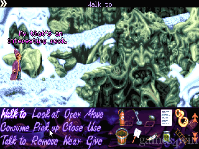 Simon The Sorcerer may have a sugary story-line and a fairy tale aura, but its puzzles really are (excuse me) bitch-mutha, hard-rocking, X-rated, Gott in Himmel affairs. They're, kind of, stacked on top of one another. Although you have a couple of simple use A on B type problems, several objects can only be obtained by a convoluted method. Find A, use A on B, talk to C, go to D, use B to dig up E, tell F that you've found E, wait for G to turn up and in the meantime use H on I to make J, then get E back off F in exchange for J, give J to K who'll give you M, go back to B, push B with M, and then finally receive N which is part one of subquest two, which, in turn is but a quarter of the main quest. Although the puzzles are quite logical, the distance between the first object you find and the eventual object you win can be massive.