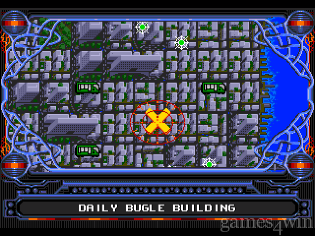 You play as Spider-Man in a daunting, city-wide search for a bomb planted by Kingpin, while the cops and Kingpin's henchmen chase you. Your search is aided by the Spideytech 9000, an overview map of the city that you use to decide where you want to look next. Some of the areas you can enter are dangerous but will yield no clues... and no bomb... so choose carefully. Once you have cleared an area, the location is marked with a yellow "X." Clearing some areas will also lead you to an archvillain, such as Electro. After you defeat him, you'll see animation footage of Spidey and the bad guy. Listen to these sequences carefully for clues about where to search next.