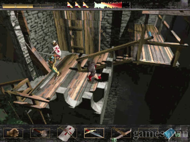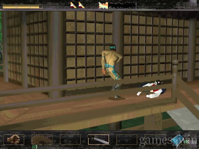 On the Prince Of Persia side however... Well, leaping over crevasses and hanging onto ledges has never been a good idea in 3D games with continually changing viewpoints and scaling, mainly because you can never get to grips with the pixel perfect placement necessary. (Luckily, Time Commando's designers realised this and have kept such moments down to a bare minimum). What this ultimately means, though, is that the only stuff to cross over from Prince Of Persia isn't the stuff which made that particular game a classic. Oh well.