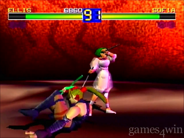 The popular 3-D fighting game, Toh Shin Den, made exclusively for the PlayStation, is now on the Saturn. All of the original characters (Eiji Kayin, Sofia, Rungo, Fo, Mondo, Duke, Ellis, Gaia and Sho), look similar to the PlayStation version and there is also an additional character, Cupido, exclusively in Toh Shin Den S. To fight against Cupido, you must beat all the characters without continuing with the difficulty set on hard. Unlike the PlayStation version in which you must input a code to play as Sho and Gaia, play through the game with a maximum of one continue and beat both Sho and Gaia and then you can play as the Bosses. There are many different game modes that can be chosen at the Main Menu; Story Mode, One-Player Game, Versus Human and Versus CPU.