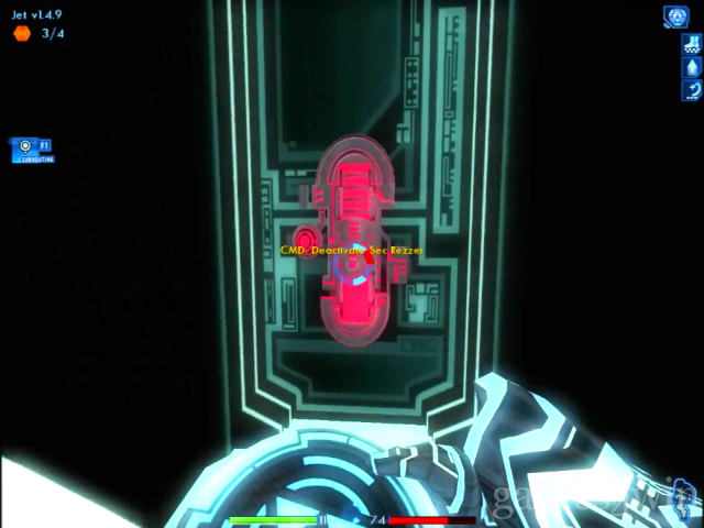 In the single-player game, you'll be able to tackle each level in a variety of ways, thanks to a collection of download stations which will ba dottad around the computerised world, and provide you with a series of power-ups. As Frank explained, We call our weapons and armour Subroutines, which are little programs that you can download. They come in three different states: Alpha, Beta and Gold. The higher the upgrade the more memory they take up. These include stealth, shooting, speed and agility upgrades, all adding to the gameplay variety and replay value. You can change your enhancements any time you want," adds Frank. So if you're stuck on one part of a level you can reconfigure yourself and try and tackle it in a whole different way.