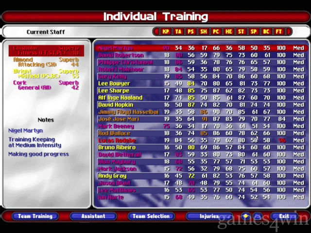 There's a kind of halfway option on the financial front, in that you have an assistant to help with all those onerous tasks you can't be arsed to do yourself (like managing the team, if you're Ruud Gullit). And there's another to keep an eye on training and make suggestions - but mine was shite. I overtrained several players to see what happened, and he never once suggested I change them, even though all their hernias were hanging so badly they looked like cows' udders.