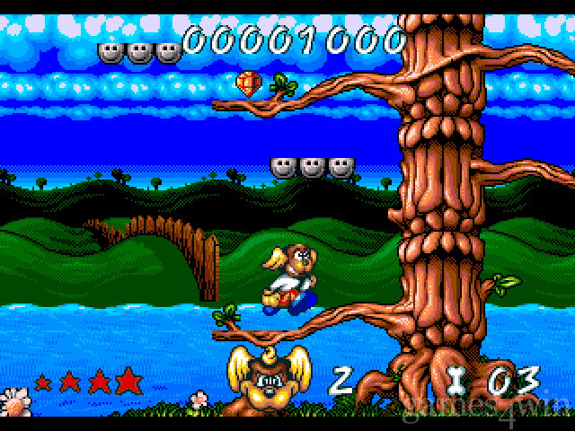 The action starts at the Bunny Hop Meadow and stretches across more than 19 levels of star shootin' fun. Animated sequences at the beginning of the game bring the story to life. The control pad can be configured to your playing style and there is a password feature to keep track of your progress.